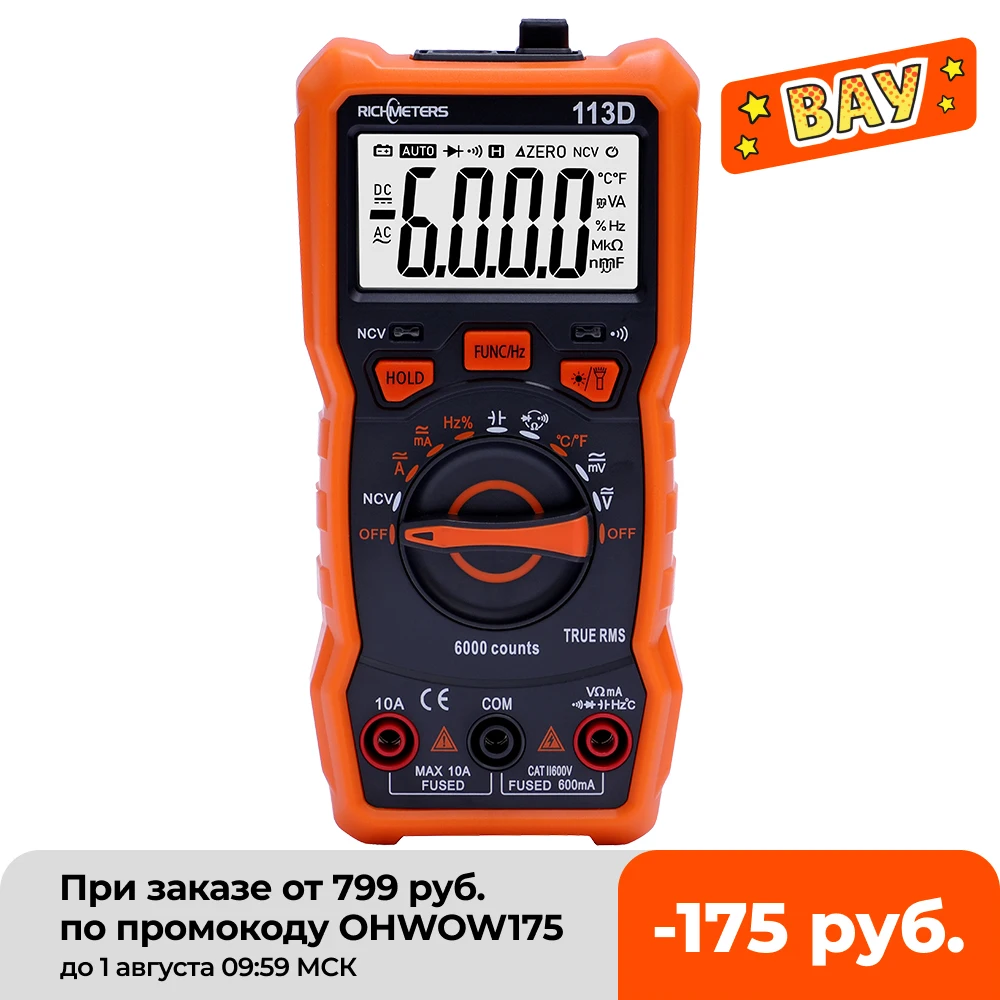 RICHMETERS RM113D NCV Digital Multimeter 6000 Counts Auto Ranging AC/DC Voltage Meter Flash Back Light Large Screen 113A/D
