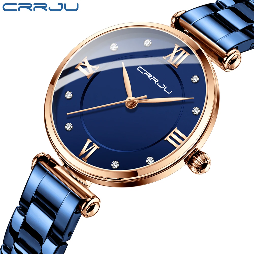 Women Watch CRRJU Fashion Luxury Blue Watch for Women Casual Waterproof Quartz Ladies Stainless Steel Watch relogio feminino