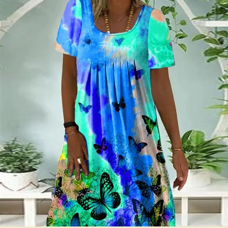 Women's 2021 Summer Autumn Short Sleeve Round Neck Pleated Printed All-Match Dress Women Fashion Casual Loose Dress